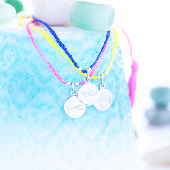 Die zarten Armbändchen sind handgearbeitet und haben jeweils ein Silberblättchen mit einem Herzen auf der einen Seite und einem Wort der Stärkung auf der anderen Seite eingeprägt.