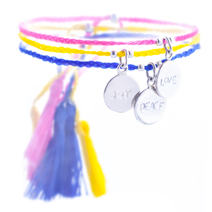 Die Farbe des Baumwollbändchens entspricht der Energie des Wortes. Das Schmuckstück sieht somit nicht nur sehr hübsch aus, sondern es unterstützt Sie auch während des Tages dabei, in Ihre Freude mit dem Gelb, in Ihren Frieden mit dem Blau oder in Ihre Liebe mit dem Rosa zu kommen. Besonders kraftvoll ist es natürlich, wenn Sie diese drei Qualitäten miteinander verbinden und alle drei Bändchen an Ihrem Handgelenk vereinen.