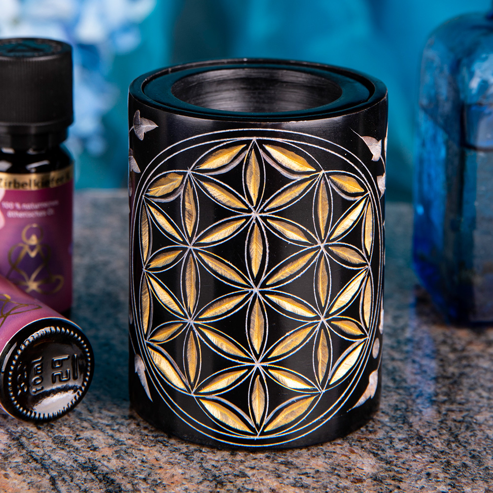 Stilvolle Aromalampe mit eingravierter Lebensblume für das energetisierende Beduften. Die Blume des Lebens ist ein starkes Schwingungssymbol, welches ein absolut harmonisches, schwingendes Feld erzeugt.