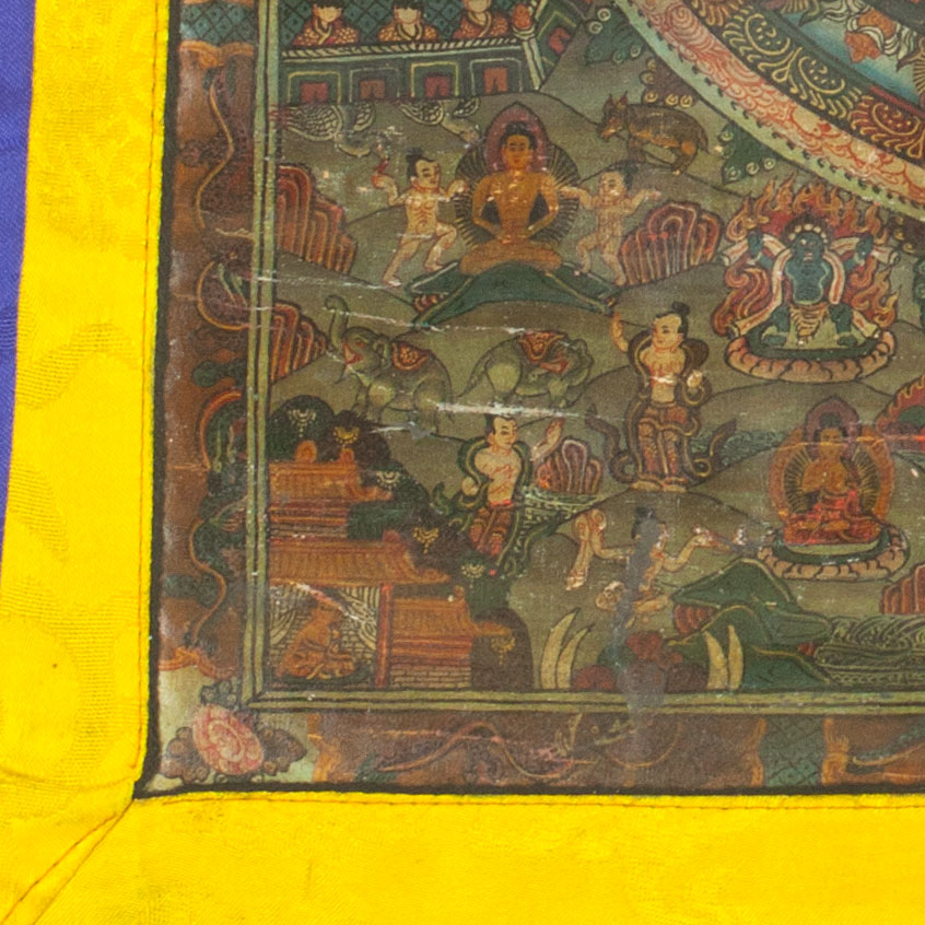 Das Thangka ist Handgemalt in Tibet und in einer traditionellen Seidenbrokatbordüre eingerahmt.
