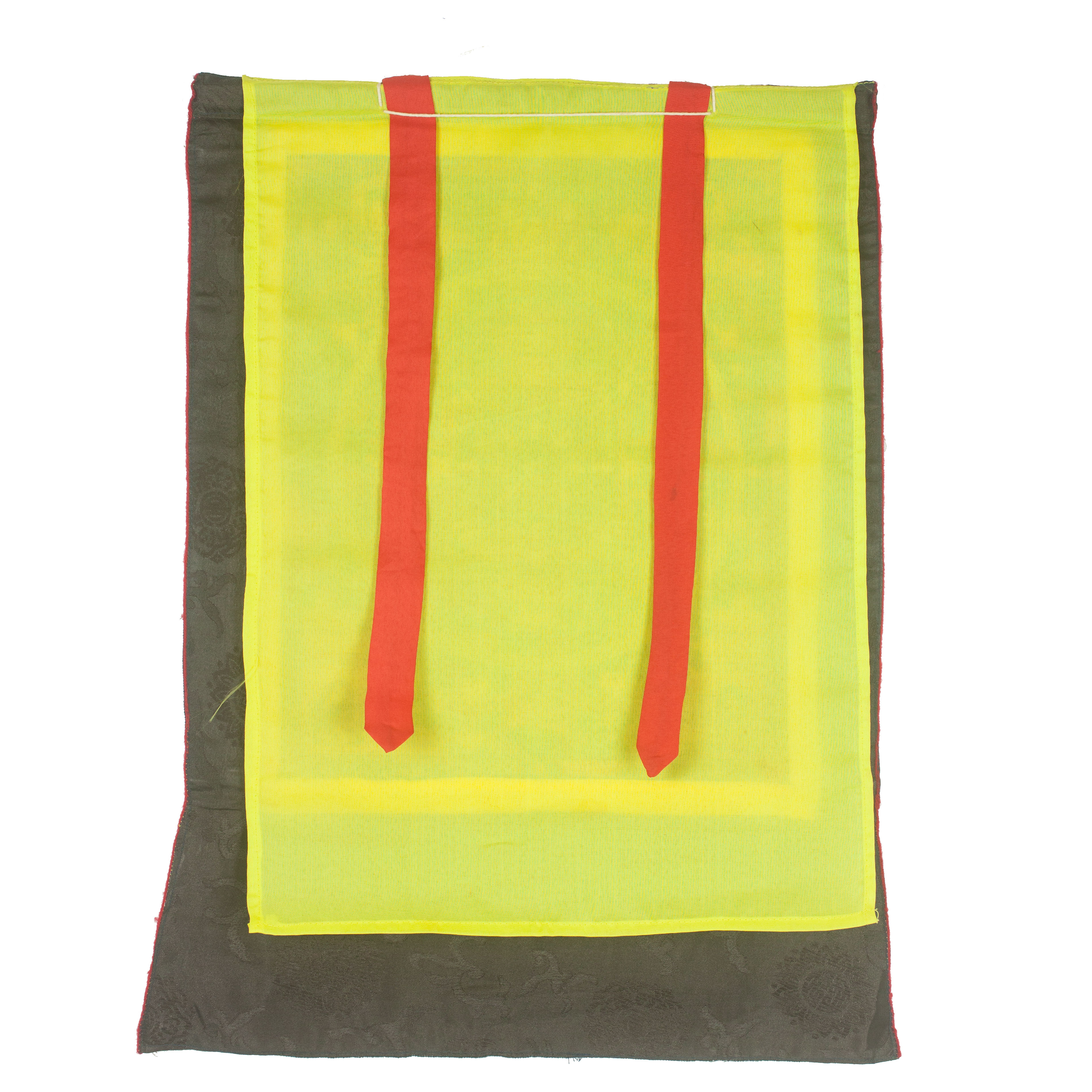 Das Thangka ist Handgemalt in Tibet und in einer traditionellen Seidenbrokatbordüre eingerahmt.