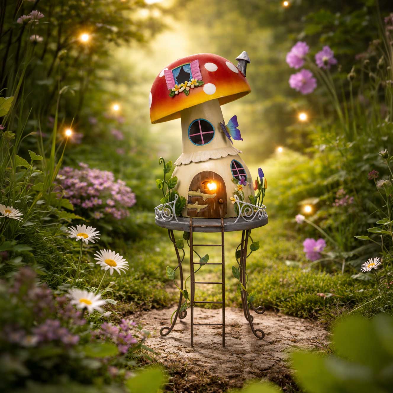Design: Feenhaus in Fliegenpilz-Form auf einer Metall-Leiter mit Plattform, Ranken und Garten-Details.