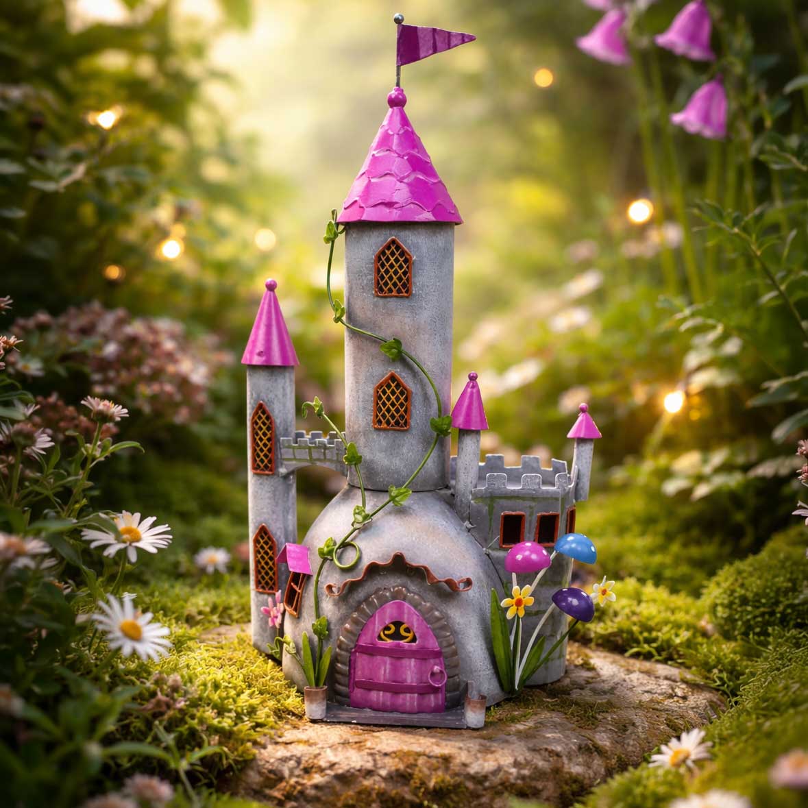 Design: Mehrstöckiges Feenschloss mit Flagge, Ranken und einem kleinen Garten aus Zauberpilzen.