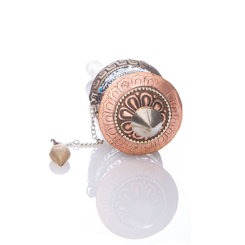 Die Gebetsmühle ist traditionell verziert mit leuchtenden Akzenten aus roten und blauen Korallen. Mit kompakten Abmessungen von 21 x 4 cm liegt sie gut in der Hand und ist ideal für den persönlichen Gebrauch, den Meditationsplatz