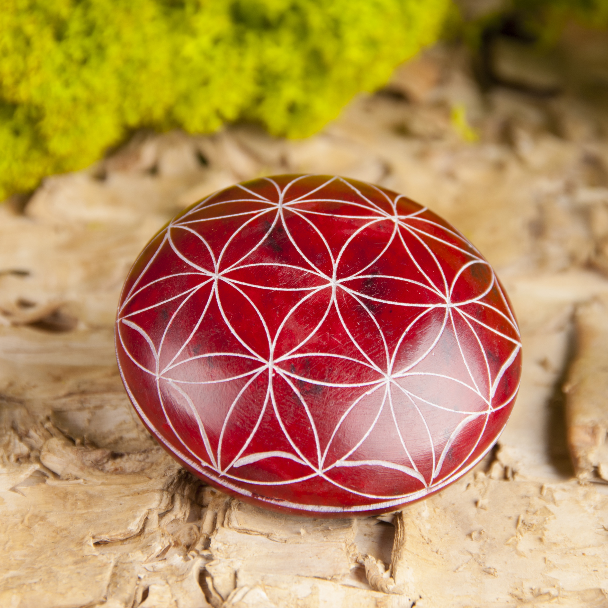 Dieser Handschmeichler ist ein wahrhaft angenehmes Objekt für die Hand und das Auge. Gefertigt aus weichem Speckstein, wurde die Oberfläche kunstvoll mit der Blume des Lebens handgraviert – dem Symbol für vollkommene, harmonische Ordnung und die Urform des Lebens.