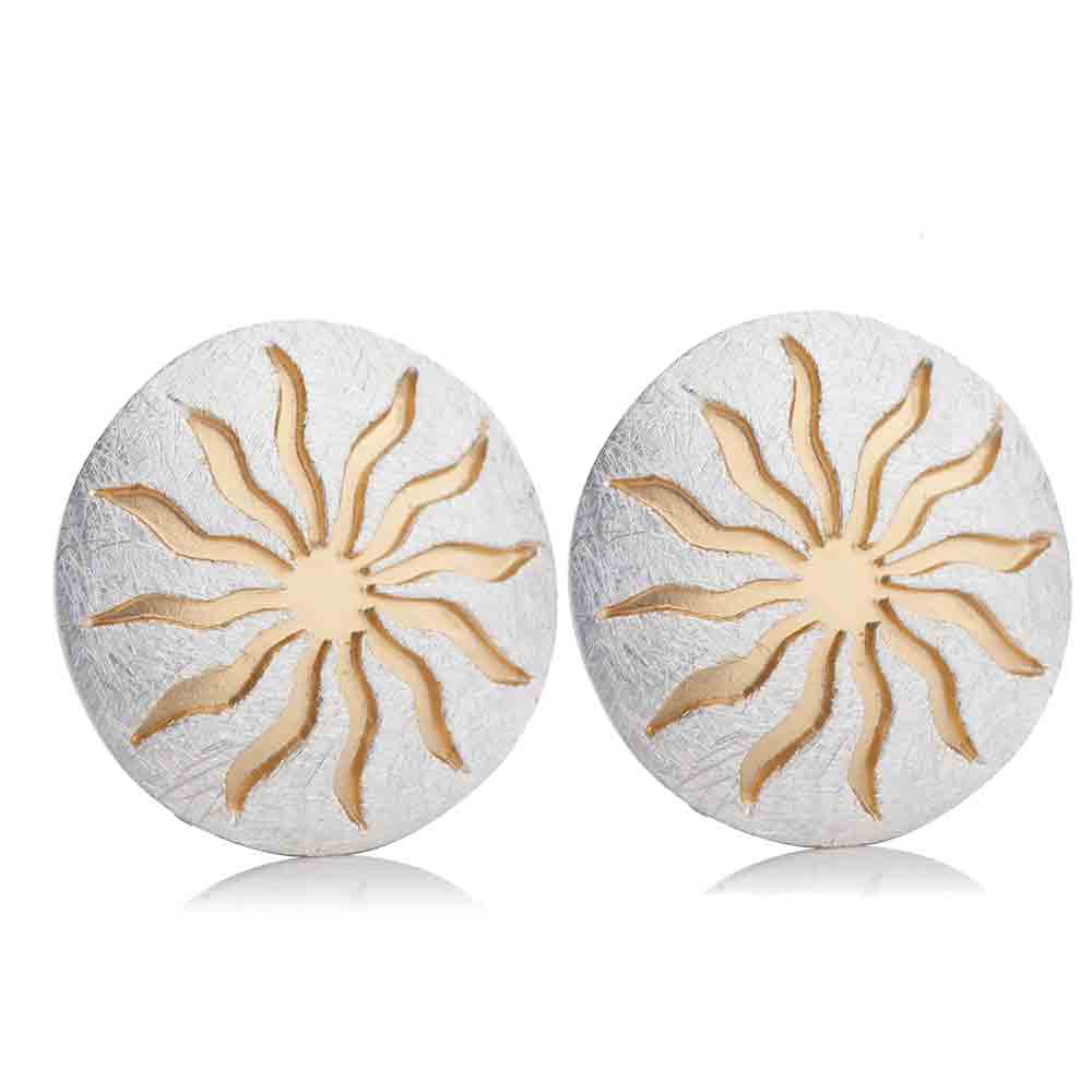 Ohrstecker "Sonnenrad" in gekratzter Optik aus teils vergoldetem Sterling-Silber. Dieser schöne Schmuckanhänger stellt das Sonnenrad dar, welches Sie mit dem Kern Ihrer Seele verbinden soll. Die zwölf Speichen des Sonnenrads stehen in Bezug zu den Tierkreiszeichen. Die Sonne mit ihrer Symbolik steht aber auch für Lebendigkeit, Ausdauer und Kraft.