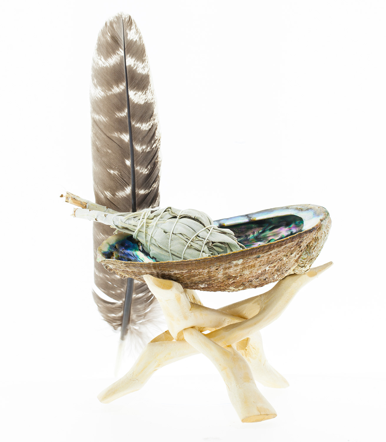 Perfekte Kombination aus weißem Salbei-Stick, großer Abalone-Muschel und Räucherfeder. Alles, was du zur energetischen Reinigung brauchst. Ebenfalls enthalten ist ein handgeschnitzter Stativ aus Holz für die Abalone-Muschel.