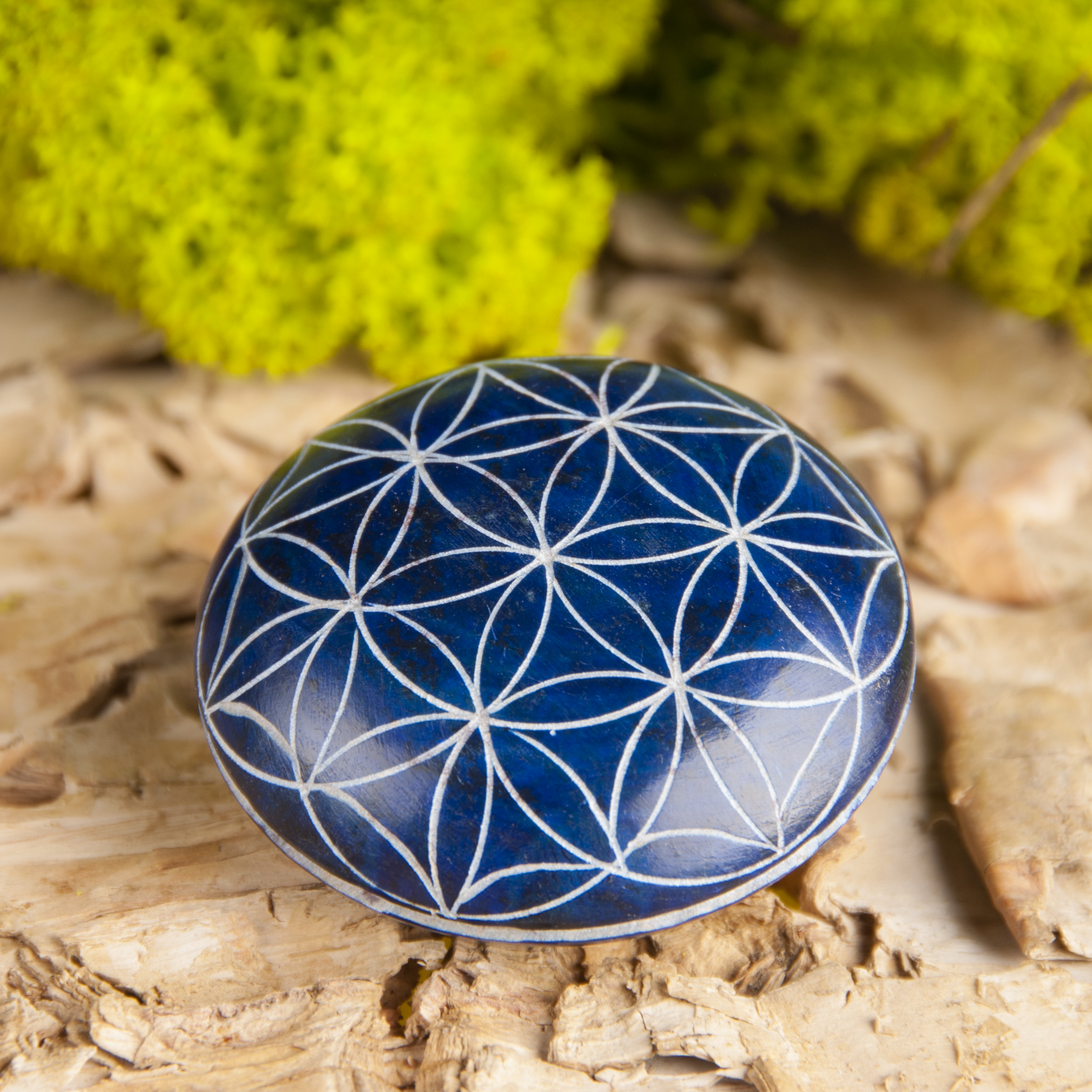 Dieser Handschmeichler ist ein wahrhaft angenehmes Objekt für die Hand und das Auge. Gefertigt aus weichem Speckstein, wurde die Oberfläche kunstvoll mit der Blume des Lebens handgraviert – dem Symbol für vollkommene, harmonische Ordnung und die Urform des Lebens.